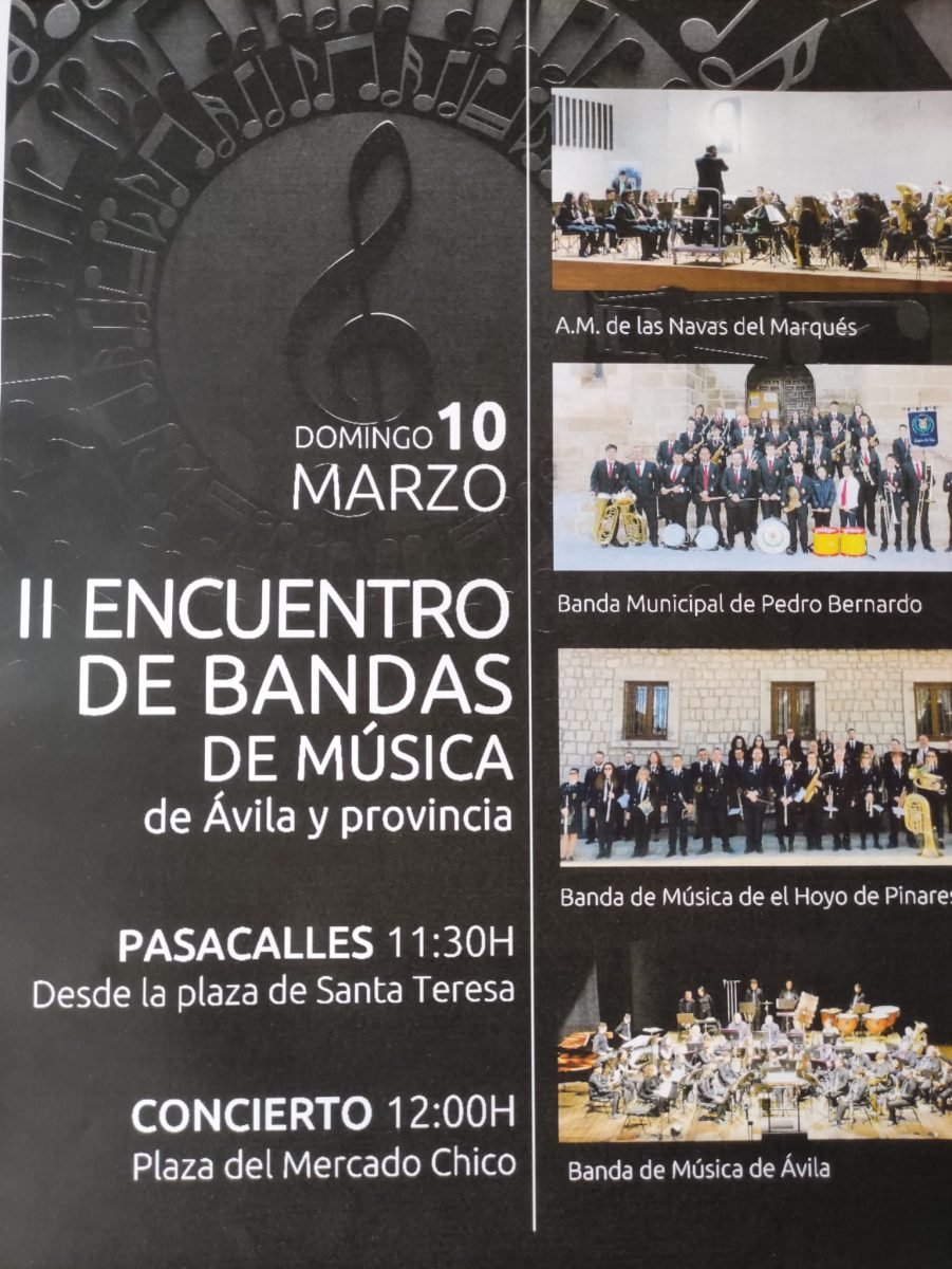 Arrancará a las 11,30 horas con un pasacalles de las bandas desde la plaza de Santa Teresa hasta el Mercado Chico. Y a las 12,00 horas arrancará el concierto en el que participarán la Banda de Música de Ávila, la Agrupación Musical de Las Navas del Marqués, la Banda Municipal de Pedro Bernardo y la Banda de Música de El Hoyo de Pinares.