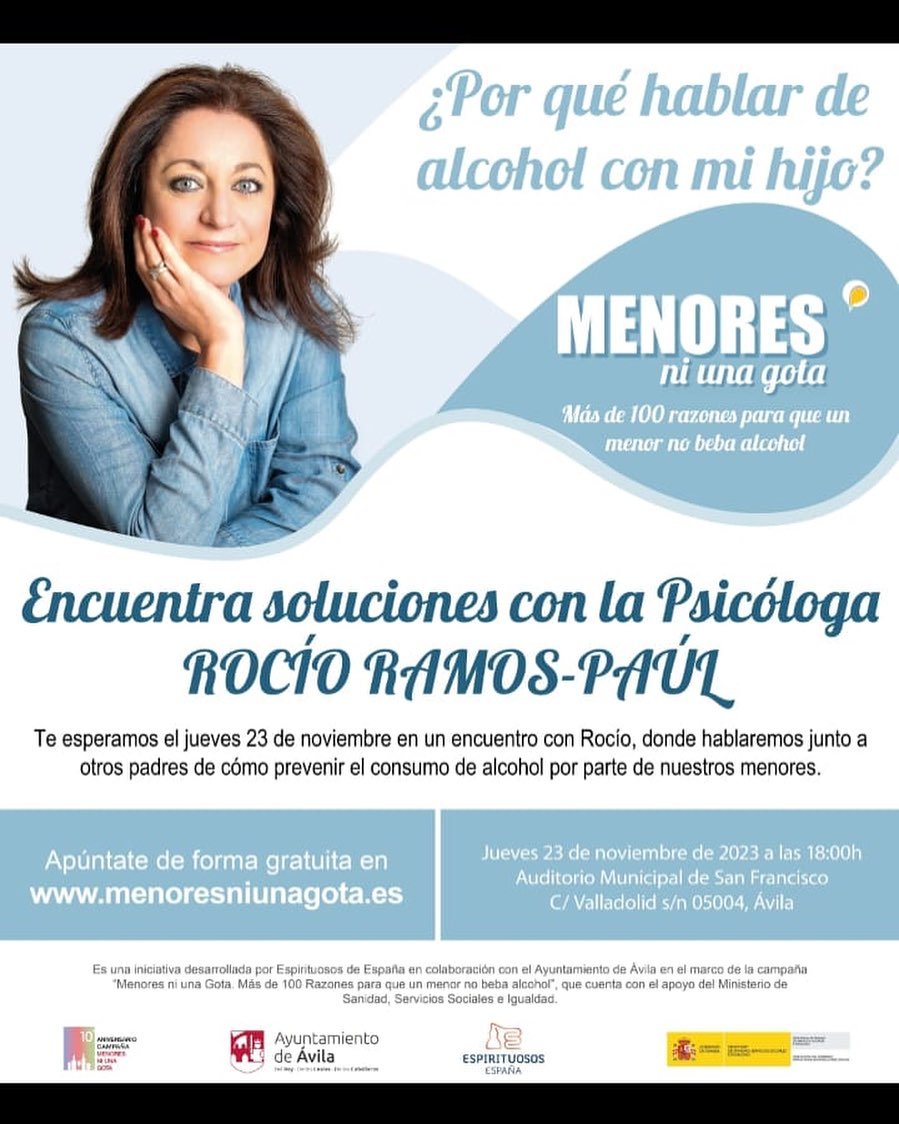 Bajo el título ‘¿Por qué hablar de alcohol con mi hijo? Menores: ni una gota’, Ramos-Paúl nos ofrecerá más de cien razones para que un menor no pruebe el alcohol.