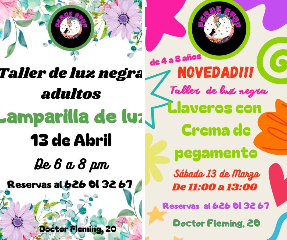 Y ya por la tarde, Irene ha organizado un taller de luz negra para adultos. Estos podrán ir solos o acompañados de sus hijos. Ya sabemos que son muchos los que disfrutáis de estos talleres con vuestros hijos mayores: manualidades, música, un refresco… El plan es chulísimo para la tarde del sábado.